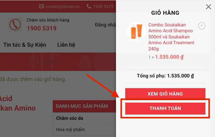 Tiến hành “Thanh toán” để chuyển sang bước tiếp theo