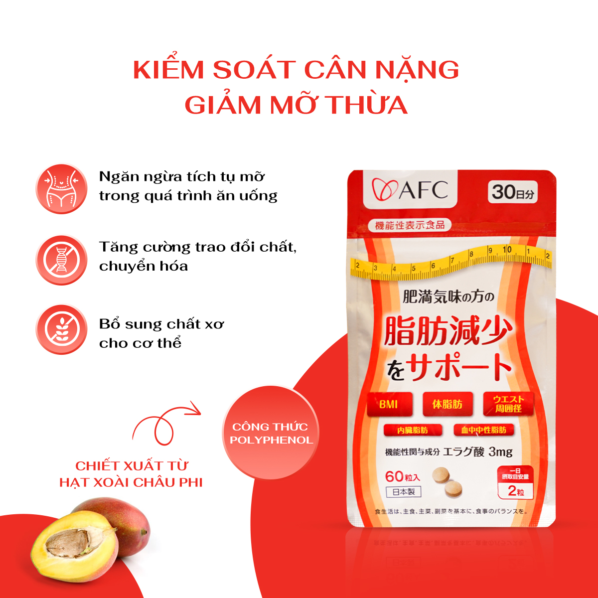 – Chiết xuất xoài Châu Phi (Irvingia gabonensis): 159mg, chứa 1.5mg axit Ellagic.
