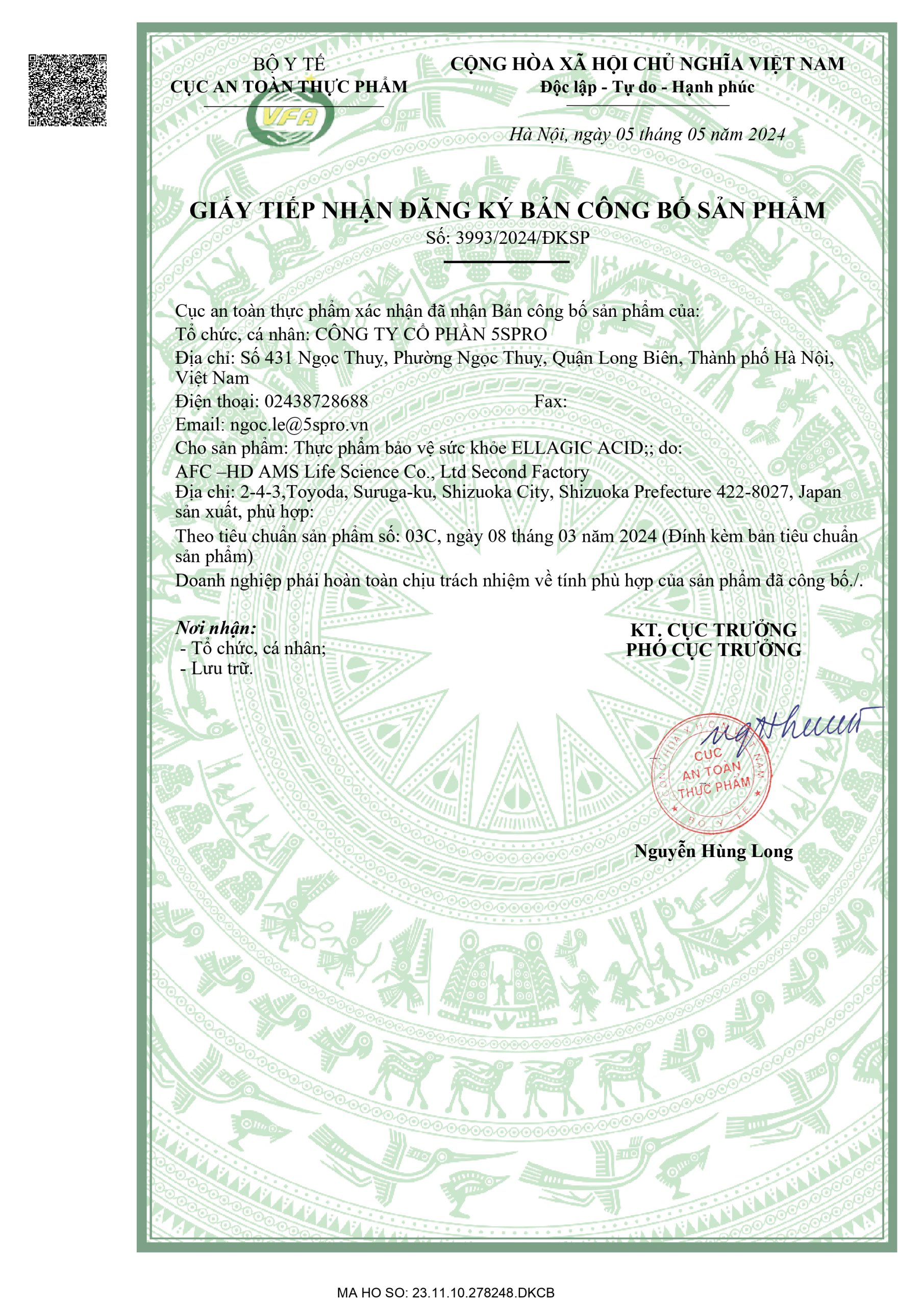 – Xuất xứ/ đơn vị sản xuất: Nhật Bản / AFC-HD AMS Life Sciences Co., Ltd., Second Factory